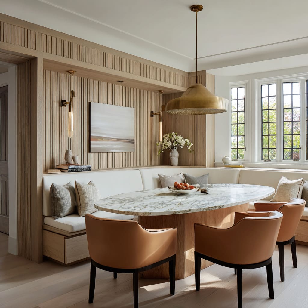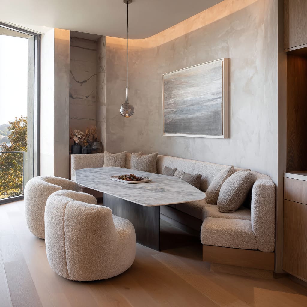 concepto de comedor lounge con banqueta clara, mesa ovalada de piedra y nicho de esquina iluminado