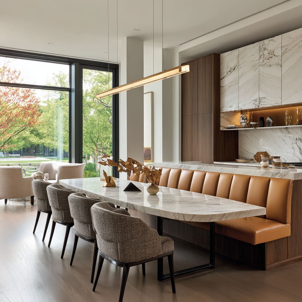 zona de comedor contemporánea con banqueta de cuero caramelo con canalé y tablero de piedra clara