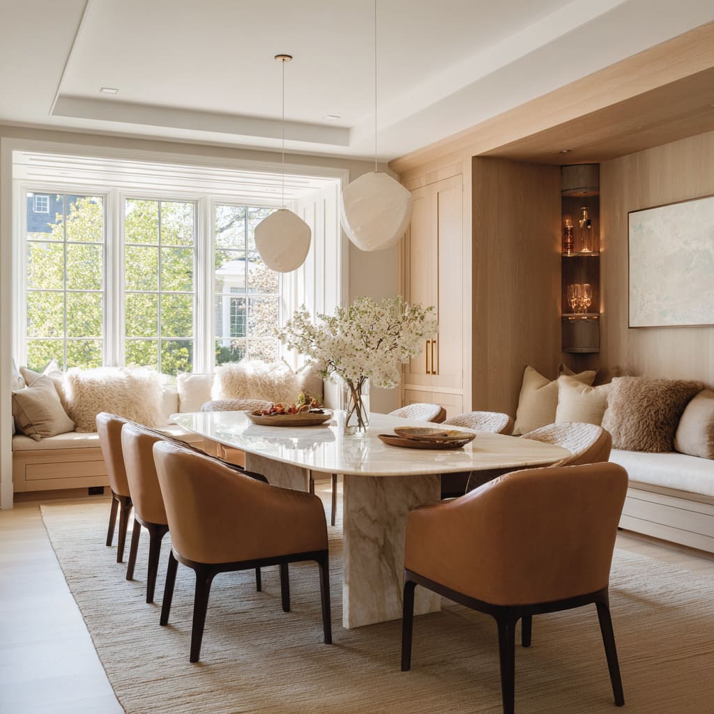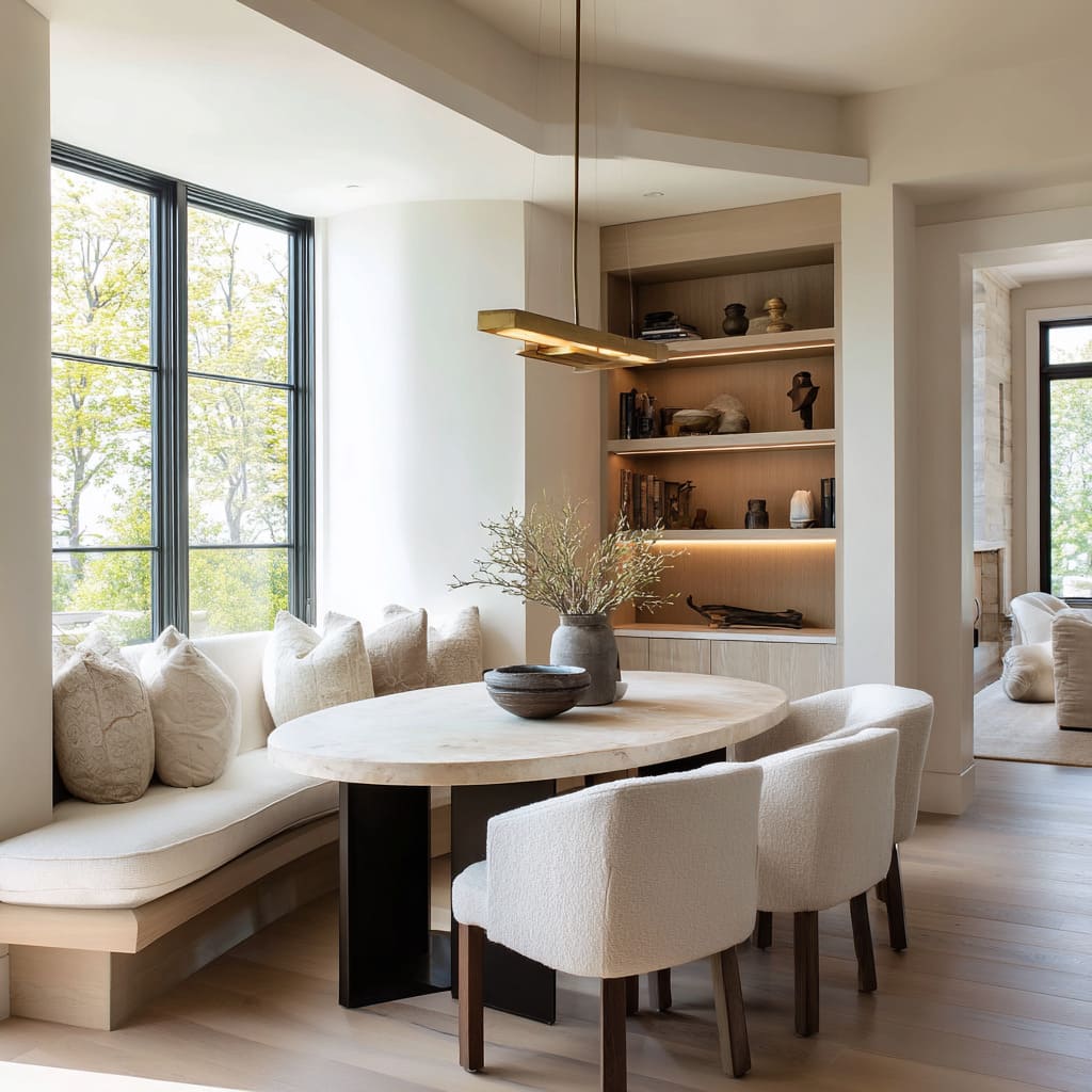 rincón de comedor junto a ventana con banqueta, mesa ovalada de piedra, colgante lineal y estantes iluminados