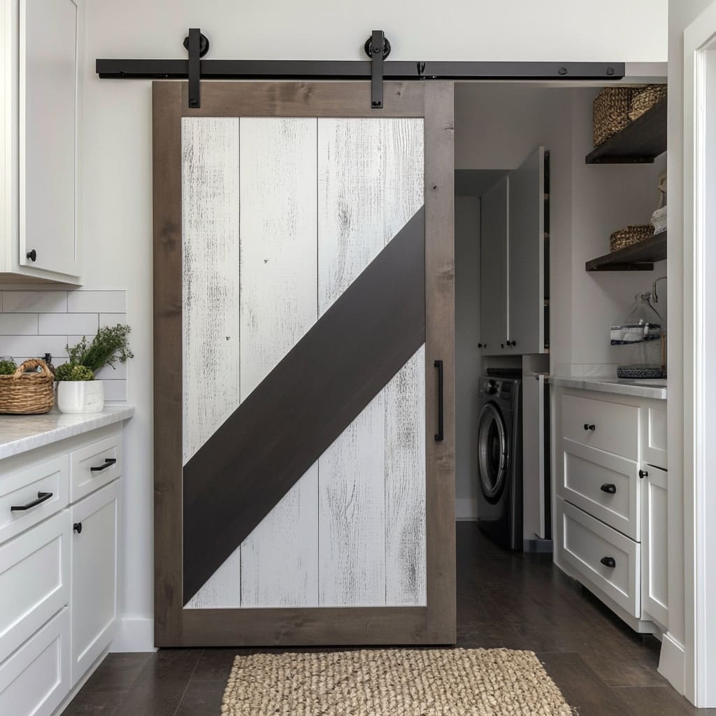 - En zonas de servicio o lavandería se aceptan bien composiciones de alto contraste, donde las franjas oscuras o los herrajes negros ayudan a que la puerta destaque entre muebles y electrodomésticos.