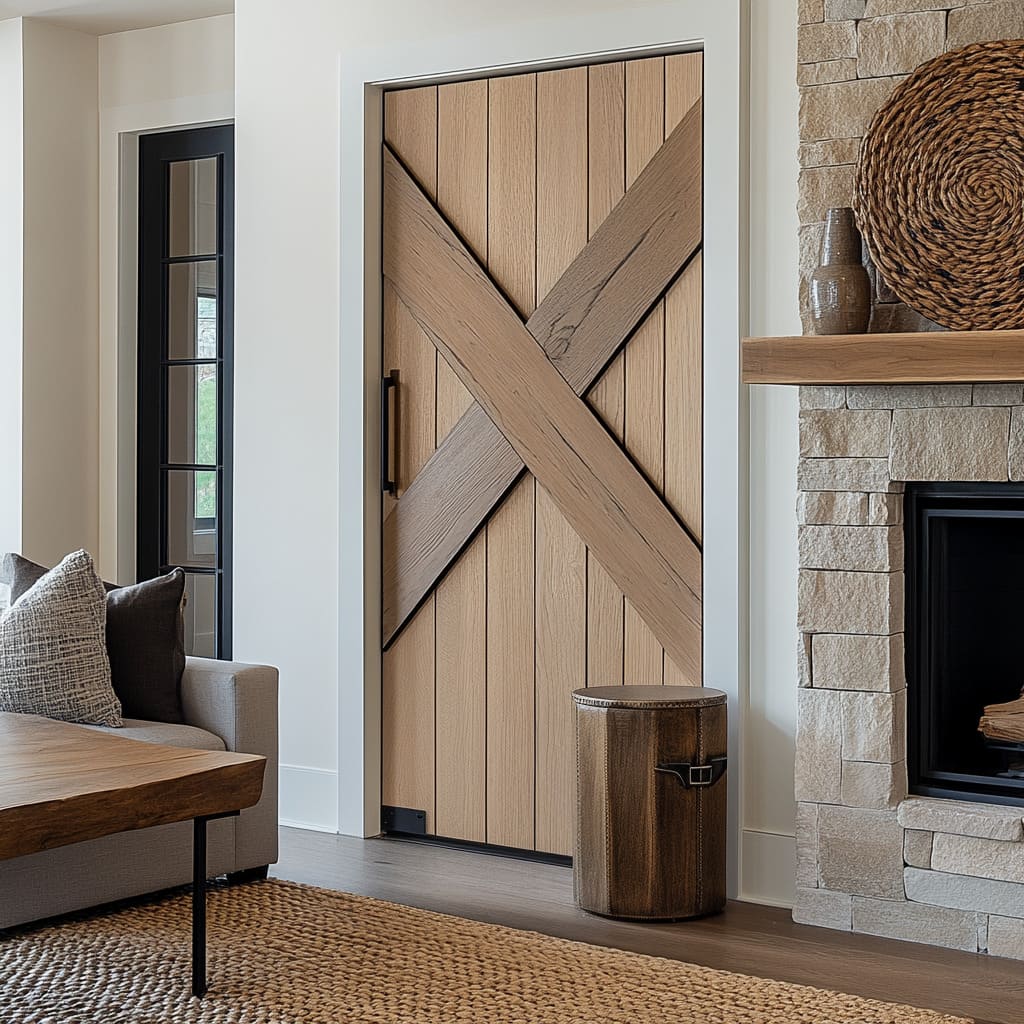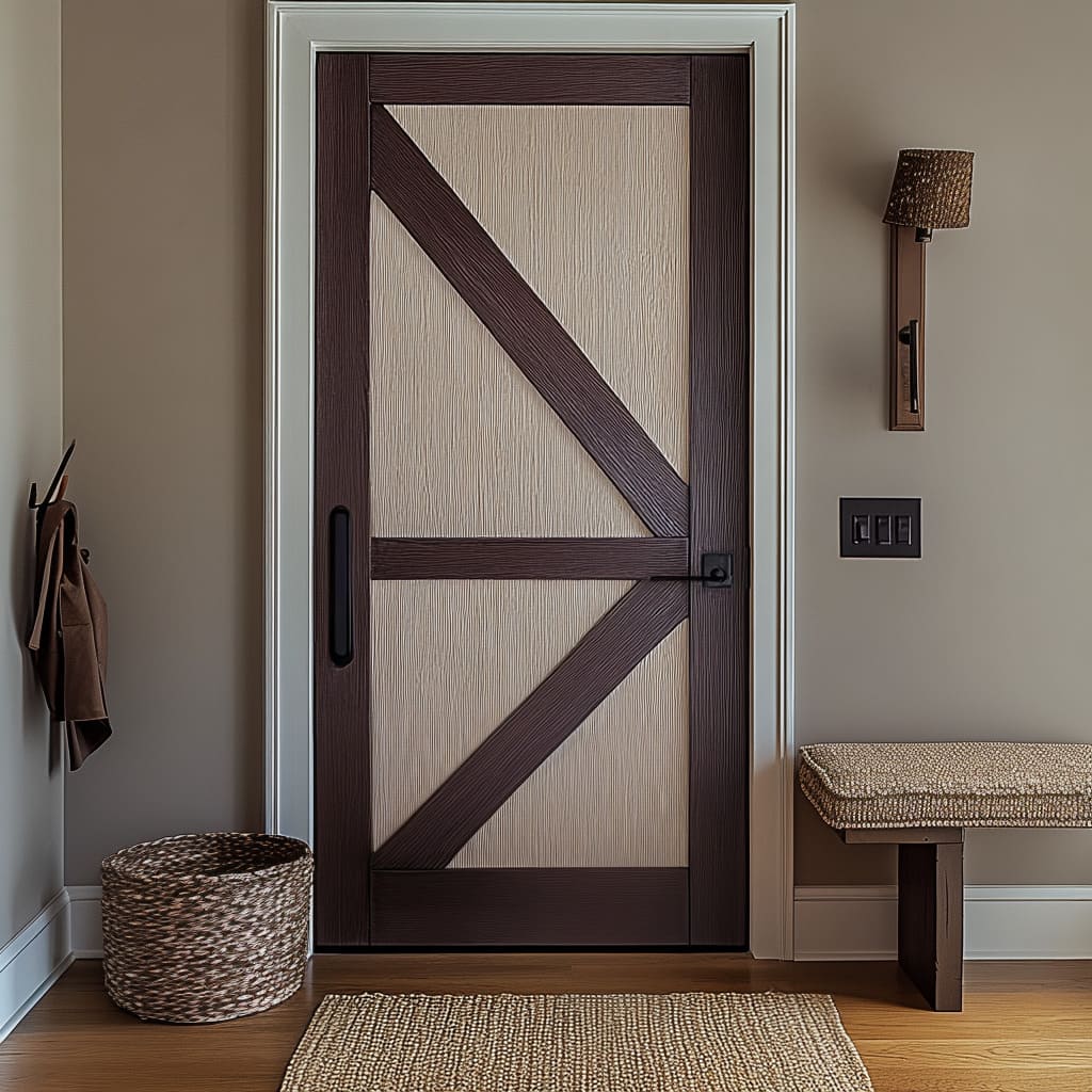 - Puertas de roble con patrón en X + alfombras de yute tejidas