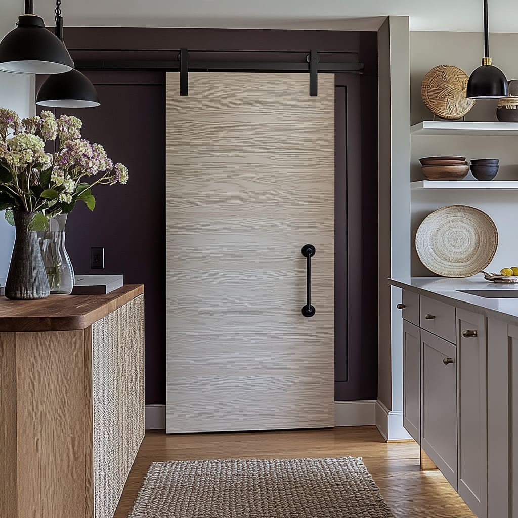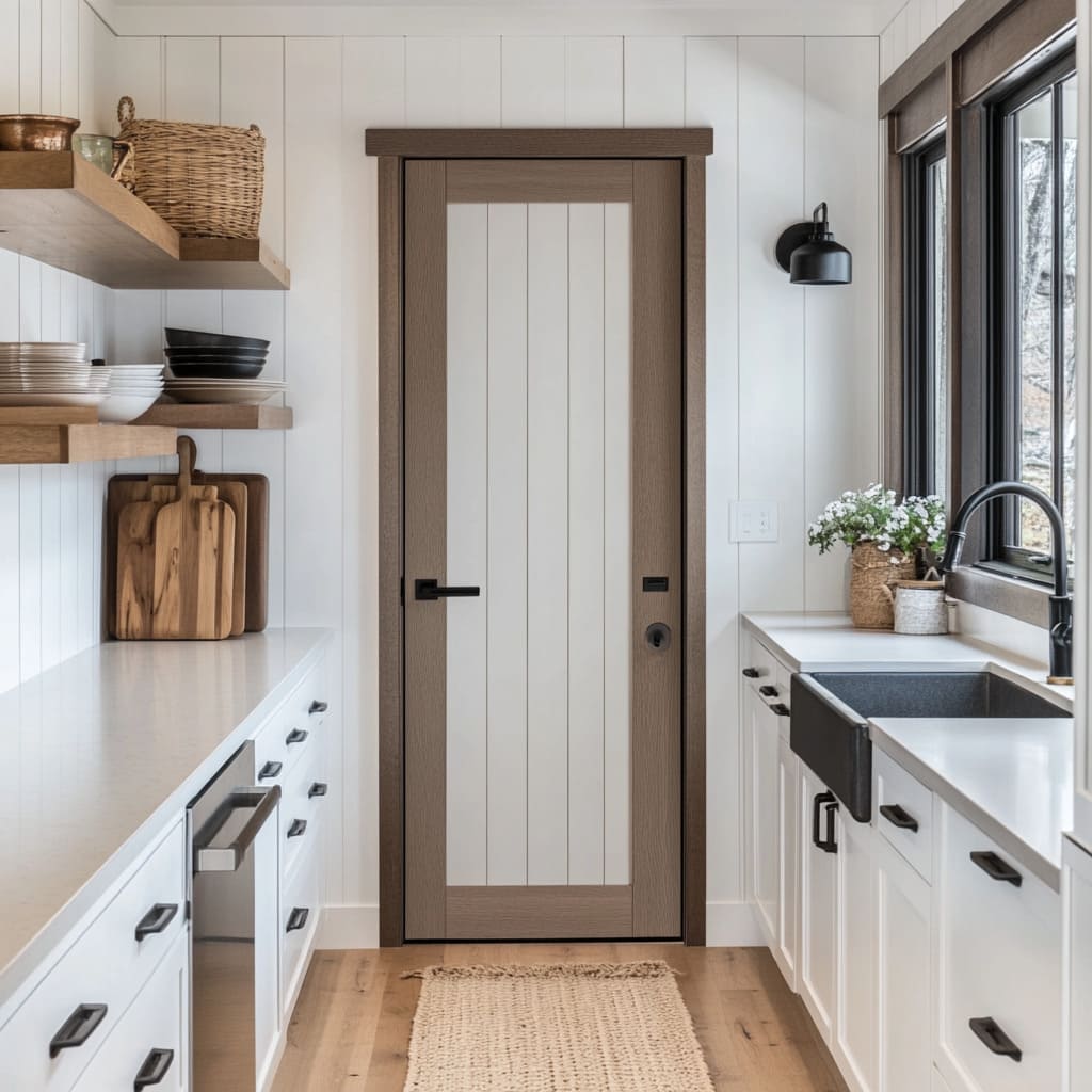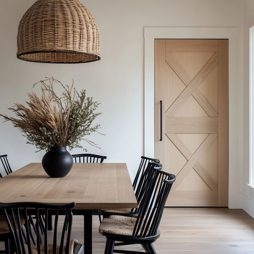 La puerta actúa a la vez como acento y como elemento conector, absorbiendo patrones de un lado de la estancia y repitiendo colores del otro. Gracias a la dirección de las líneas, la armonía tonal, la expresión de la veta y la claridad de las proporciones, las puertas farmhouse transforman vanos cotidianos en puntos de interés bien resueltos e integrados en el estilo general.