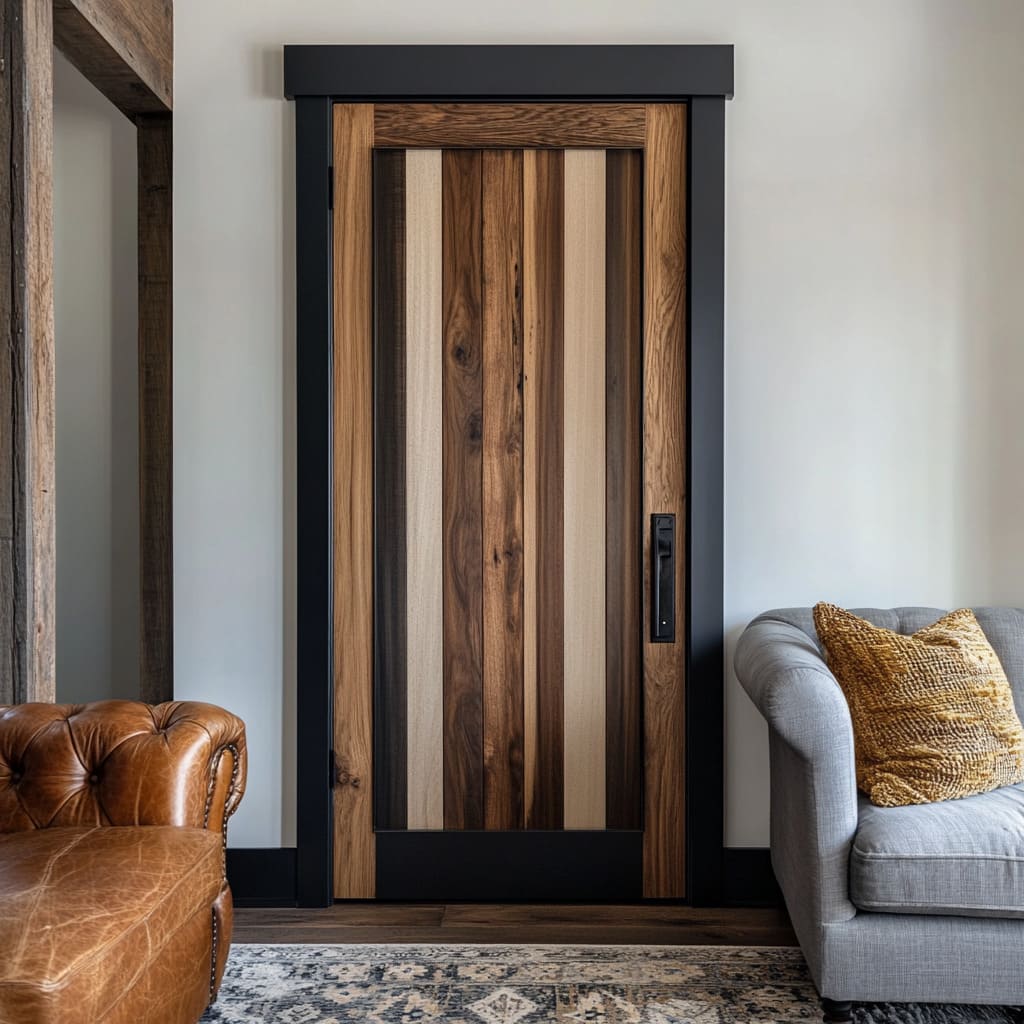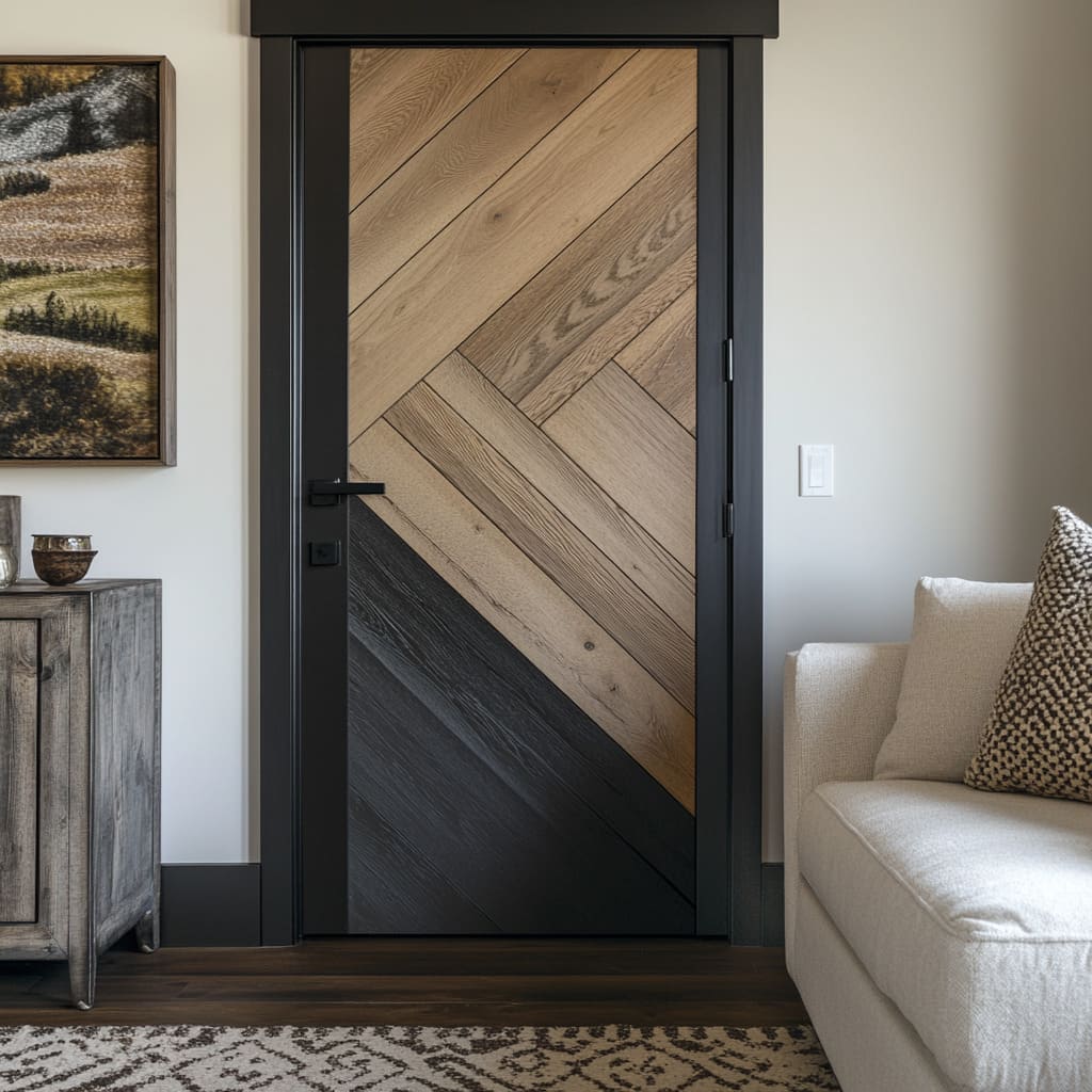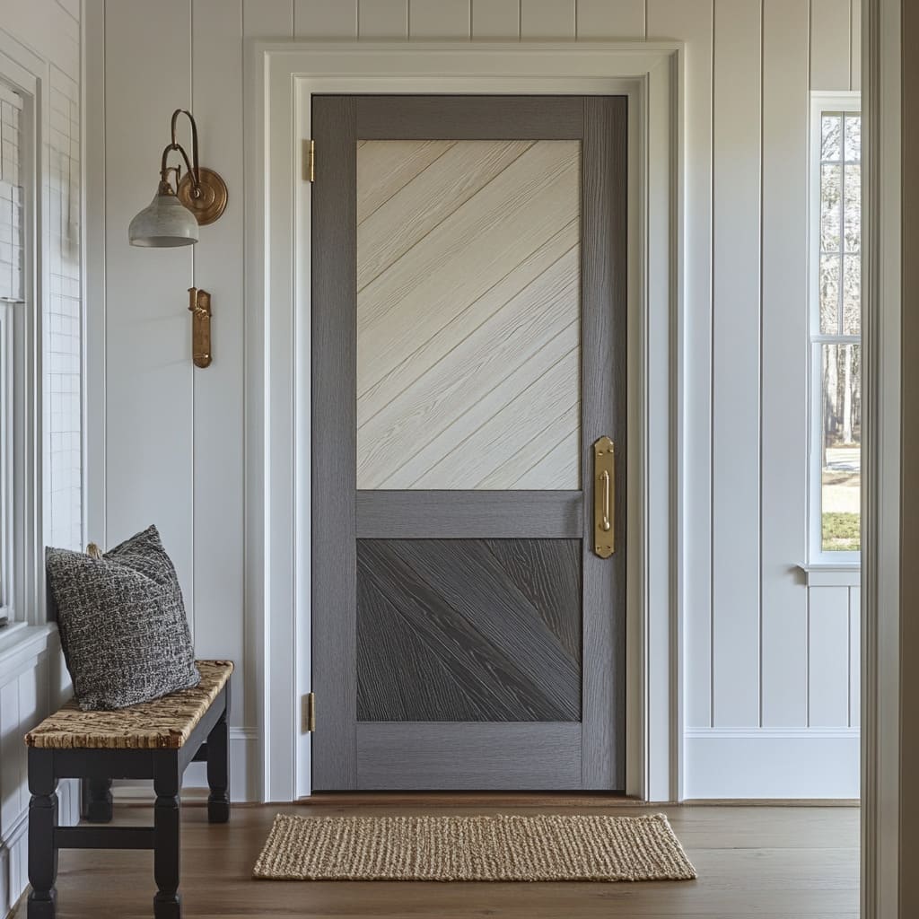 A menudo se crean “mini paletas” dentro de la propia puerta: una zona inferior más profunda y una parte superior más clara, o franjas en varios tonos ordenadas con mucha contención. Un campo diagonal en un tono que interactúa con tablones verticales en otro tono se convierte en una paleta comprimida dentro de una única hoja.