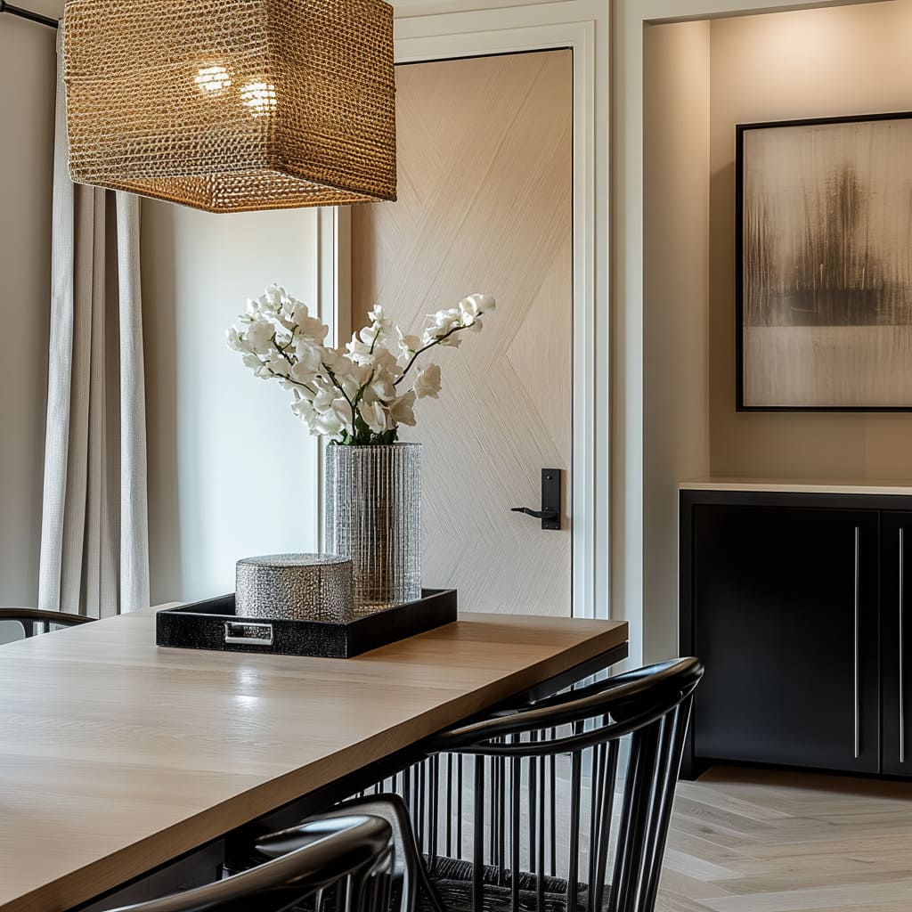 Las mesas de comedor con una veta marcada conectan con las variaciones de veta en puertas con franjas de varios tonos. Espejos redondos, bandejas murales circulares o jarrones curvos suavizan la geometría fuerte de una puerta con diagonales o verticales muy presentes, aportando equilibrio a través de la forma.