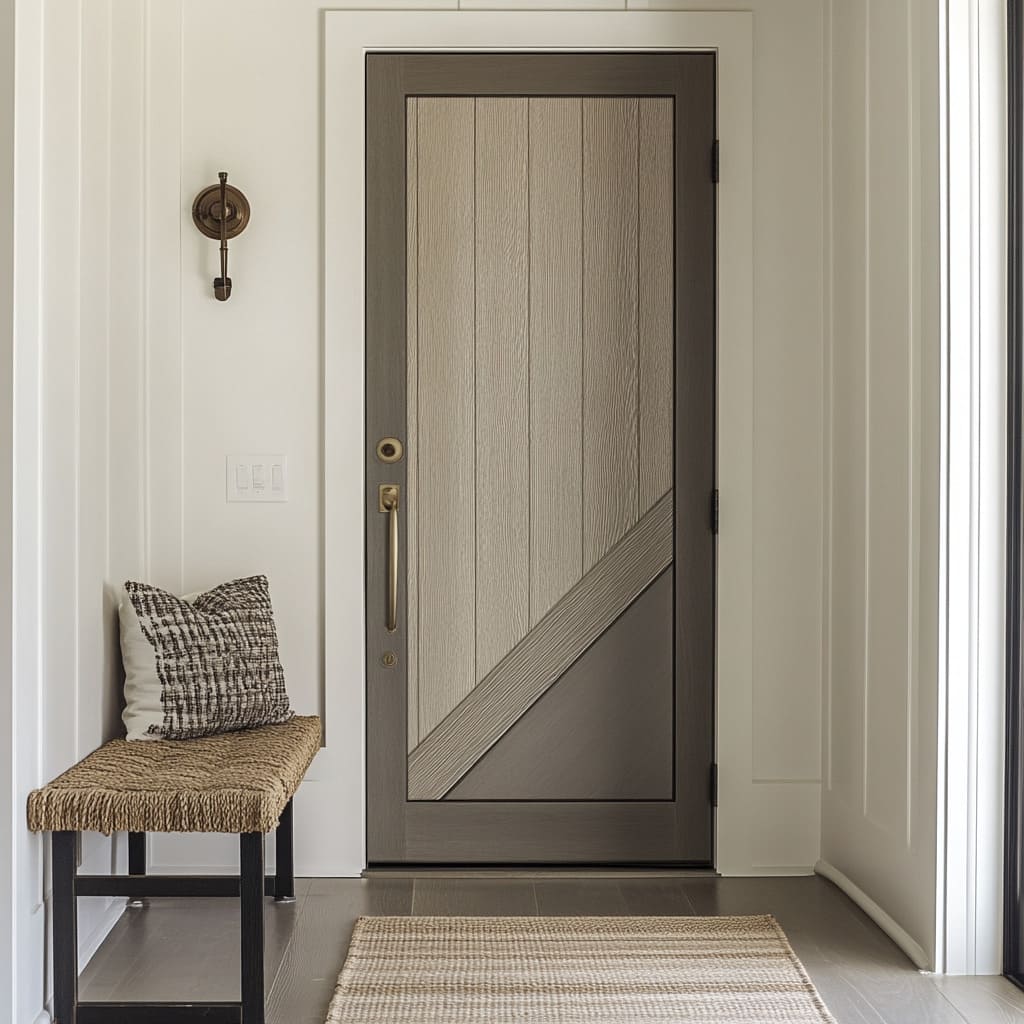 Los panelados verticales en pared se asocian muy bien con puertas que incorporan diagonales suaves o campos geométricos en tonos medios, permitiendo que las líneas verticales funcionen como un andamiaje discreto detrás de las composiciones en ángulo.