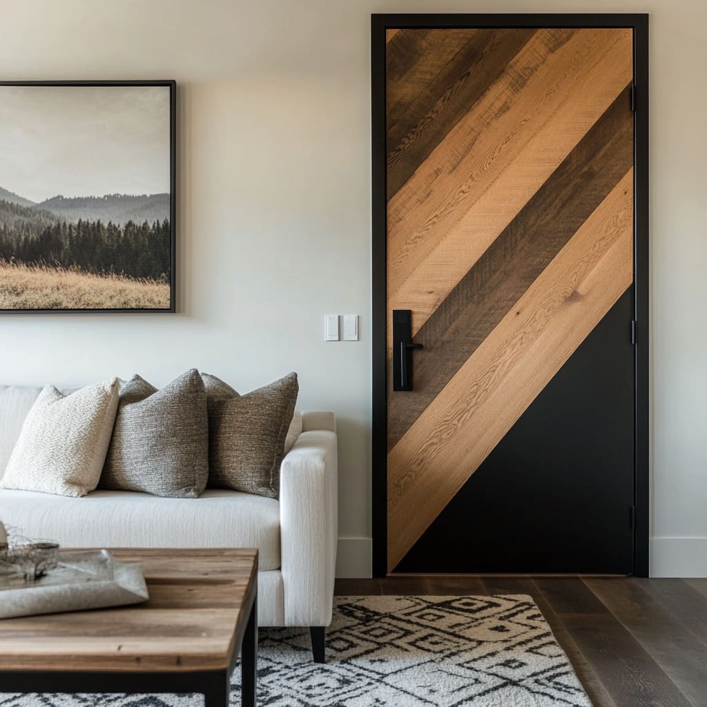 Las alfombras con suaves motivos en rombo o con finas rayas anclan las puertas gráficas en la zona de estar sin competir con ellas. Sofás neutros con cojines discretos permiten que las puertas de roble cálido se sientan estables y coherentes.
