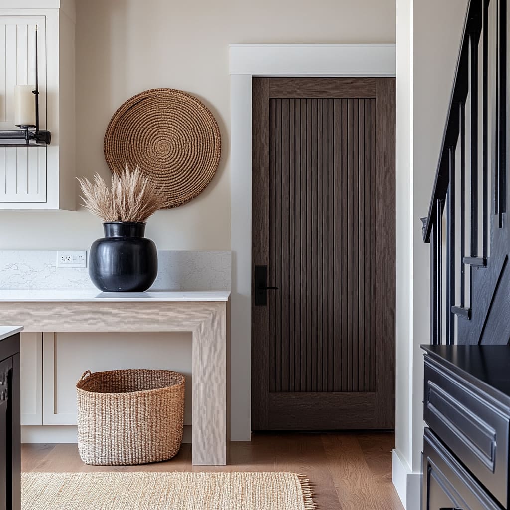 Los paneles verticales acanalados se relacionan con cestos tejidos o ramas altas en jarrones. Incluso las puertas correderas mínimas en madera muy clara funcionan como pausas tranquilas entre zonas más decoradas.