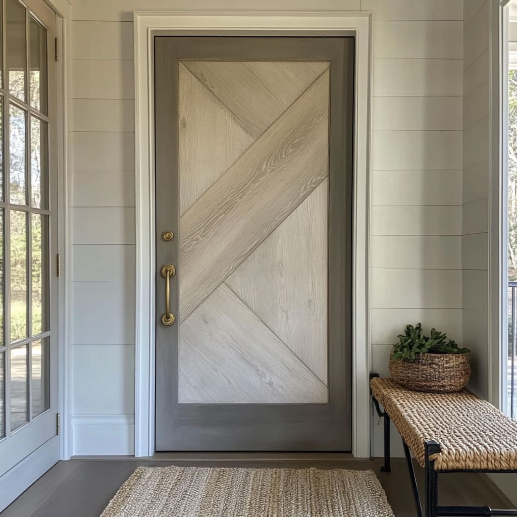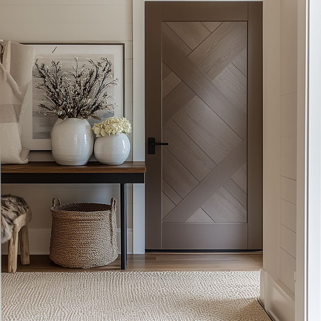 La relación entre la puerta y la pared determina si la puerta actúa como foco visual o como fondo sereno. Los muros con friso horizontal tipo shiplap suelen combinar con puertas diagonales o en espiga, de manera que una superficie aporte estabilidad y la otra movimiento.